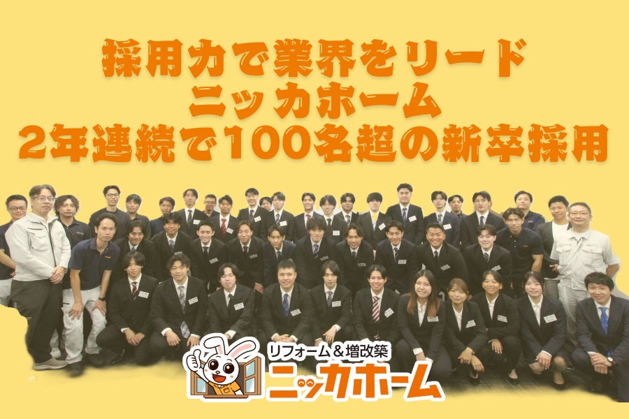 住宅リフォーム事業のニッカホームは、関東・中部・西日本・九州の4支社で2026年新卒内定式を開催し、合計で2年連続100名超の新卒採用を達成しました。役員挨拶や配属発表を行い、全国出身の内定者が今後の抱負を述べる場となりました。入社前のギャップ解消を目的とした内定者アルバイト制度や研修を通じて現場経験を積ませ、内定辞退や早期離職の防止、入社後の定着を図る育成体制を強化しています。グループ全体の社員数や売上、施工実績とあわせて採用拡大が事業成長を支える取り組みである点が示されています。