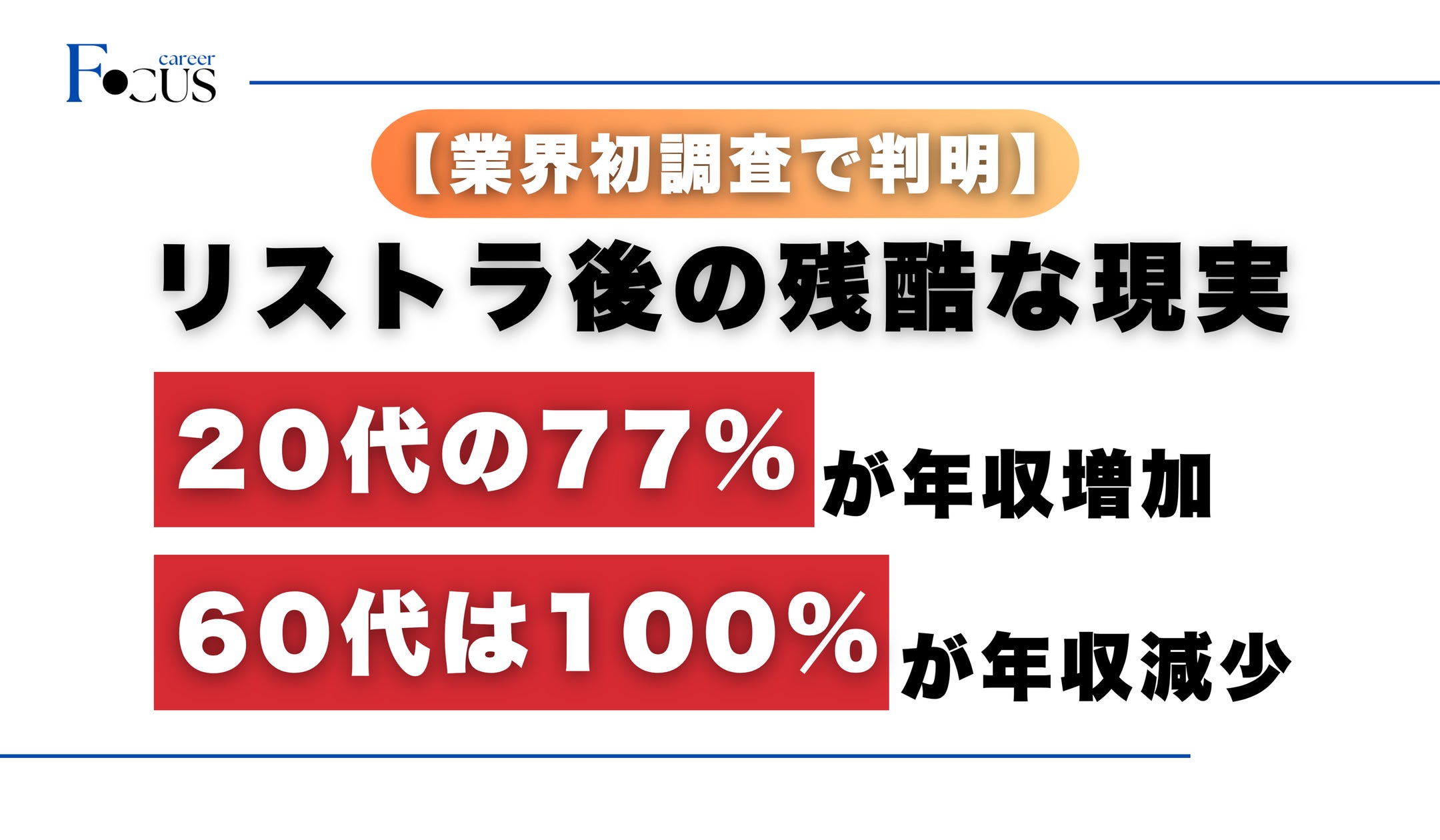 株式会社CAREER FOCUSが全国のリストラ経験者450名を対象に実施した業界初の追跡調査は、リストラ後の年収・再就職期間・精神的影響などを定量的に明らかにしました。結果は年齢による極端な格差を示し、20代の約76.9%が年収増加を経験する一方で、60歳以上は全員が年収減少となっていました。製造業、サービス業、IT・通信業にリストラが集中し、再就職まで平均4か月超、約40%が半年以上の無職期間を経験、75%以上が精神的ダメージを訴えており、個人責任論では説明できない構造的問題を指摘しています。