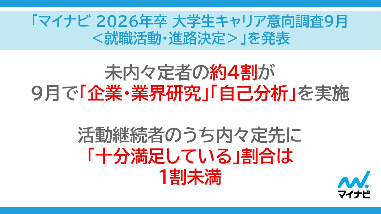 株式会社マイナビが実施した「2026年卒 大学生キャリア意向調査(9月)」の結果を発表しました。9月末の内々定保有率は88.9%で前年同月から0.9ポイント低下、活動継続率は18.9%で2.0ポイント上昇しました。文系(88.6%)と理系(89.3%)の内々定率差はほぼ解消され、活動継続者のうち未内々定者は企業・業界研究や自己分析を中心に活動し、内々定ありで活動継続する学生は選考の初期段階の受検や面接、エントリーを行っていることが示されました。内々定先に「十分満足」と答えた割合は就職活動終了者で53.3%だったのに対し、内々定あり活動継続者は7.5%と大きく差があり、内々定の質や満足度に課題が見られます。有効回答は1,268名、調査期間は2025年9月23~27日です。