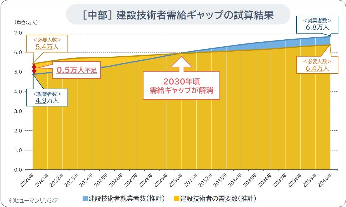 ヒューマンリソシアは中部エリア(岐阜・静岡・愛知・三重)を対象に、2040年までの建設技術者・技能工の需給ギャップを推計しました。技術者は新卒入職の増加や高齢者比率の低さで供給が増え、2030年頃に需給ギャップが解消すると見込まれます。一方で技能工は供給が減少する一方で需要は増加し、2030年に約5.0万人、2040年に約10.3万人の不足になると試算されました。これにより建設需要への対応が困難になる懸念があり、待遇改善や海外人材の積極採用、DXによる生産性向上など多面的な対策が必要だとしています。