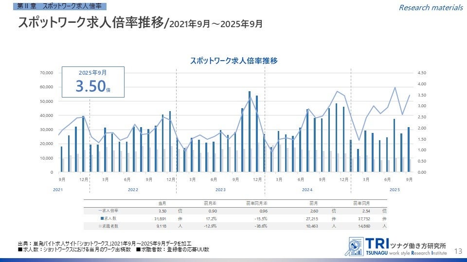 ツナグ働き方研究所は、2025年9月のスポットワーク市場をまとめた月次レポートを公表しました。求人倍率は3.50倍で前月比0.90ポイント、前年同月比0.96ポイント上昇し、16か月連続で前年同月を上回っています。一方、新規ワーク数は70,526件で前年同月比16.1%減となり、5か月連続で減少しました。平均時給は1,312円で通常アルバイト平均(1,272円)を10か月連続で上回り、運送・ドライバー職のみ前年を上回るなど職種間の差も見られます。スポットワークは短時間・単発のギグや単発バイトを含み、労働力の有効活用や収入安定の観点から定点観測の意義が強調されています。
