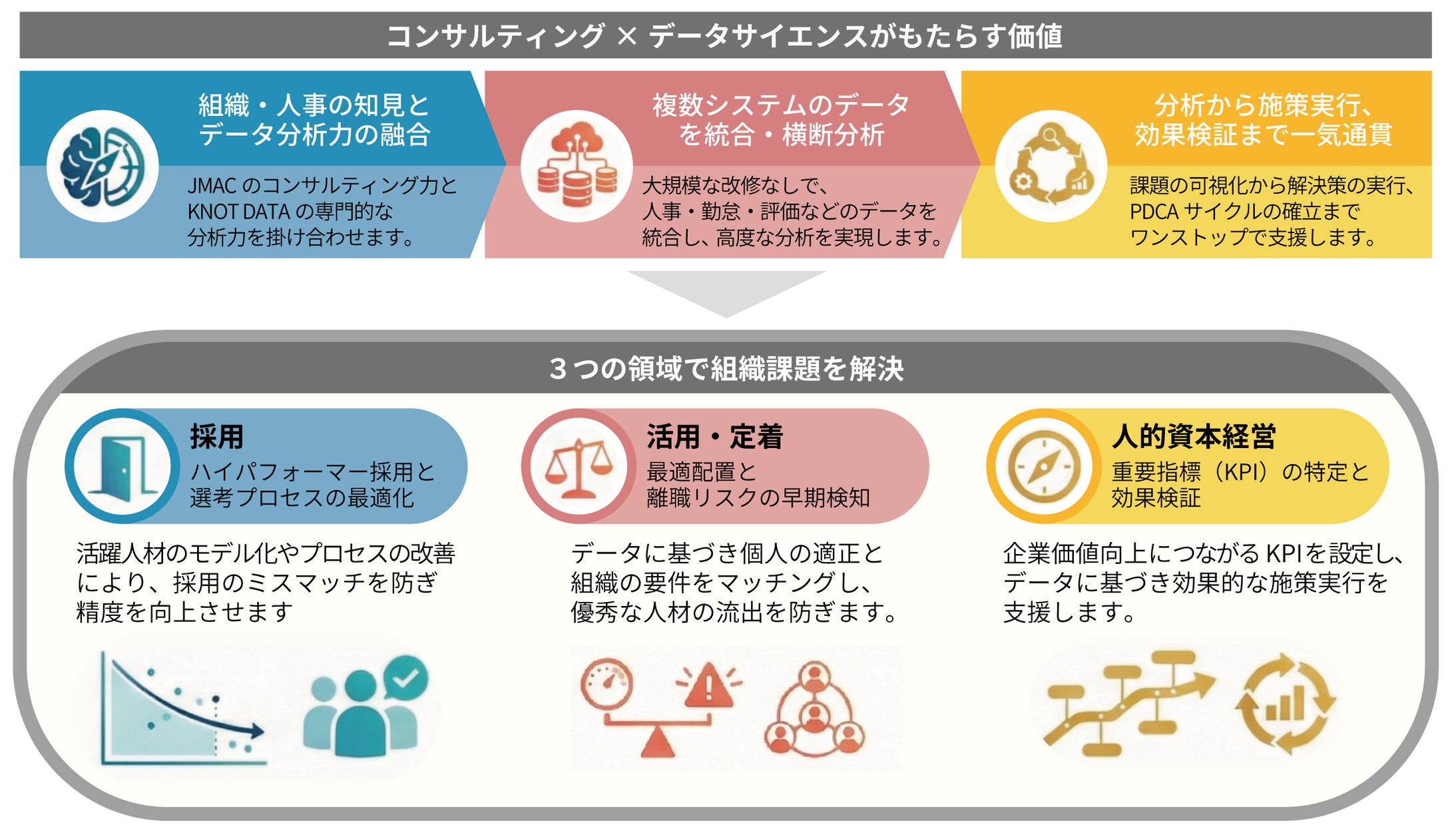 JMACはデータサイエンス企業KNOT DATAと連携し、採用・育成・評価・定着などの人事データを統合する「People Analytics Suite」を提供開始します。本サービスはAIや高度な統計手法で分析・予測を行い、JMACのコンサルティングにより施策立案から実行、半年・年次での効果検証まで一気通貫で支援します。既存システムを大規模改修せずに複数データソースを横断分析でき、採用精度向上、最適配置、離職予兆検知など人的資本経営のPDCA確立に寄与することを目指します。