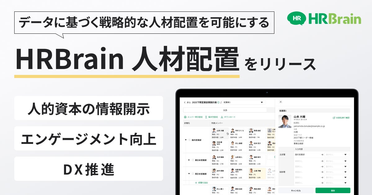 株式会社HRBrainは、新機能「HRBrain 人材配置」を提供開始しました。本機能は、人事評価やスキル、勤続年数などの人材データを一元化し、プロジェクト単位で異動候補を管理・可視化することで、配置判断の属人化や多部門間の非効率な合意形成を解消します。部署別の人数比や評価履歴を踏まえた定量的な比較・検討が可能で、ミス・重複の防止や資料作成・収集の工数削減に寄与します。2025年5〜9月の顧客ヒアリングを踏まえ、既存の組織図シミュレーションを拡張し、現場の意思決定を尊重しつつ企業全体の戦略的な人材配置を支援することを目的としています。