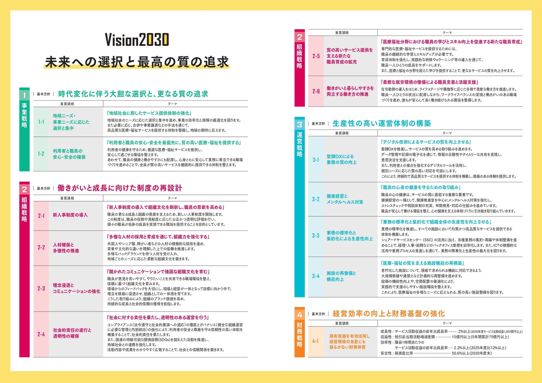 社会福祉法人聖隷福祉事業団は、2030年の創立100周年を見据え「Vision2030~未来への選択と最高の質の追求~」の中期事業計画を策定しました。本計画は事業・組織・運営・財務の4領域を基本方針とし、選択と集中、デジタル活用、新人事制度の導入、多様な人材採用、職員の心身の健康対策などを通じて、地域に不可欠な医療・福祉を将来にわたり安定的に提供することを目指す内容です。全国1都7県で多数の施設を運営する実情を踏まえ、環境変化に対応する方向性を示しています。