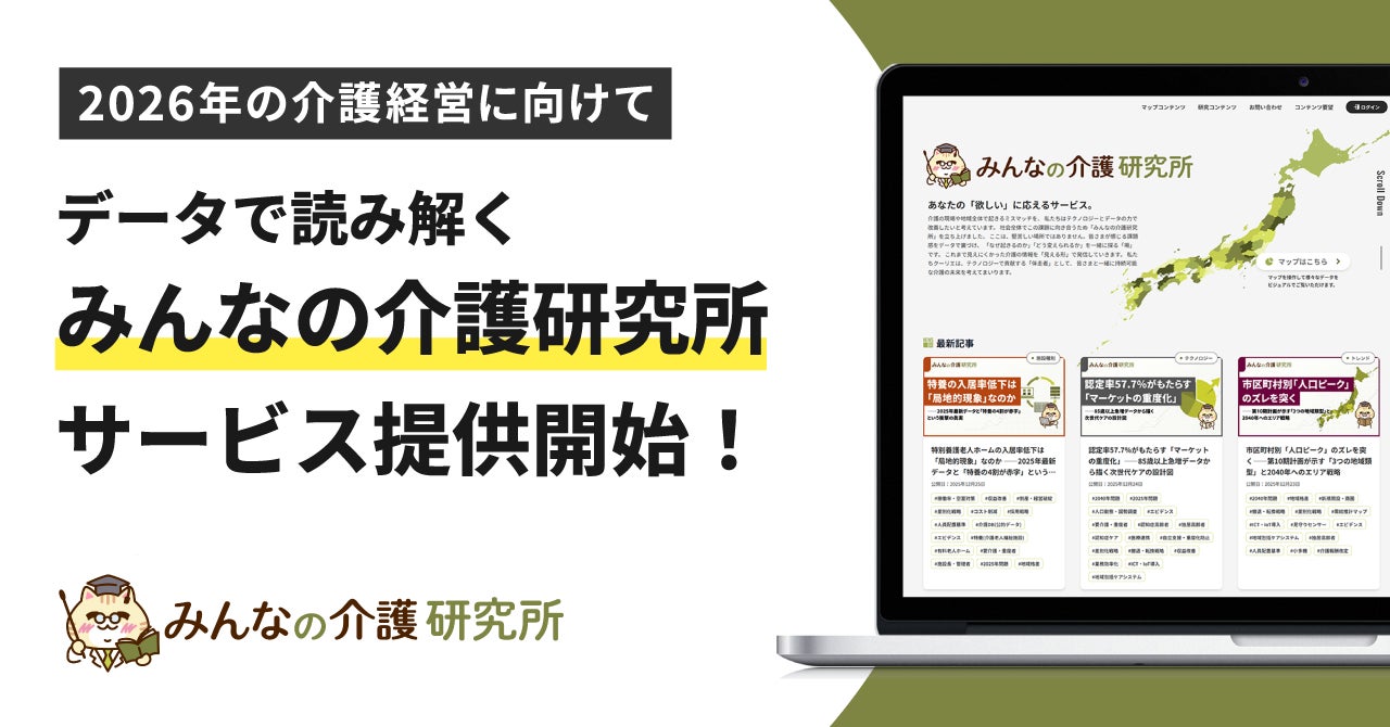 株式会社クーリエが運営する「みんなの介護研究所」は、2027年度の制度改定を見据え、2026年を分岐点として介護市場を精緻に分析する連載を開始しました。厚生労働省の公開統計と同社が運営する「みんなの介護」「みんジョブ」等から得た匿名化・統計化された1st Party Dataを組み合わせ、求人倍率15倍、収支差率2.4%といった人手不足や低収益の実態、地域ごとの需給ズレ、施設の「看取り」増加などの構造変化を可視化します。介護事業者、自治体、政策関係者、金融・不動産等に向け、共通の前提整理を提供するとともに、限定の無料競合分析など実務的な支援も行っています。