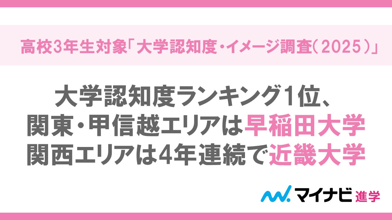 マイナビ進学総合研究所は、2026年3月卒業予定の高校3年生を対象とした「大学認知度・イメージ調査(2025)」を発表しました。エリア別ランキングでは関東で早稲田大学が1位、関西では近畿大学が4年連続1位、北海道・東北は東北大学、中国・四国は広島大学がそれぞれ上位となりました。「時代にマッチしている」項目では愛知淑徳大学や立命館アジア太平洋大学が評価され、新学部設置や教育環境の充実が要因と考えられます。志望校決定に強く影響するイメージは「学べる内容が充実」(67.6%)、「就職力が高い」(67.1%)、「サポートが手厚い」(61.3%)で、調査は2025年7月〜11月のWeb調査、有効回答6,520名(大学進学希望者4,332名)で実施されました。