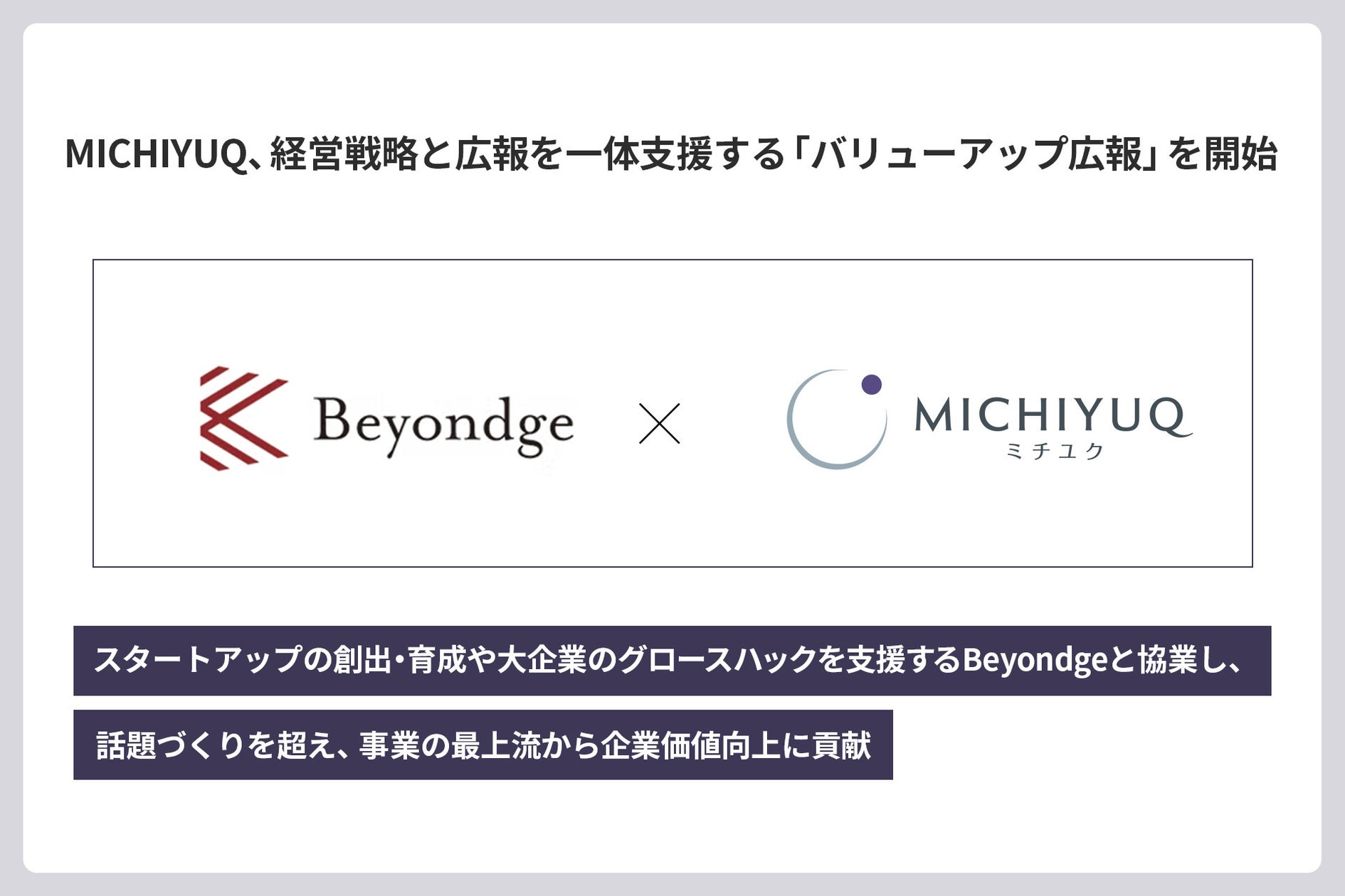 株式会社MICHIYUQはBeyondgeと共同で、経営戦略と広報を一体化する新サービス「バリューアップ広報」を開始しました。本サービスは事業の構想・戦略立案の最上流段階から広報を組み込み、単なる露出ではなく「信頼・共感」を醸成することで資金調達・採用・事業提携・受注といった経営成果の最大化を目指します。Beyondgeの事業・採用・投資・M&A・技術の5領域の知見とMICHIYUQの戦略広報力を融合し、構想策定、広報KPI設計、実行・振り返りの3ステップでハンズオン伴走する点が特徴です。日本広報学会の調査を踏まえ、広報を経営機能として最上流に据えることの必要性を訴えています。ですます調で支援を行う点が強調されています。