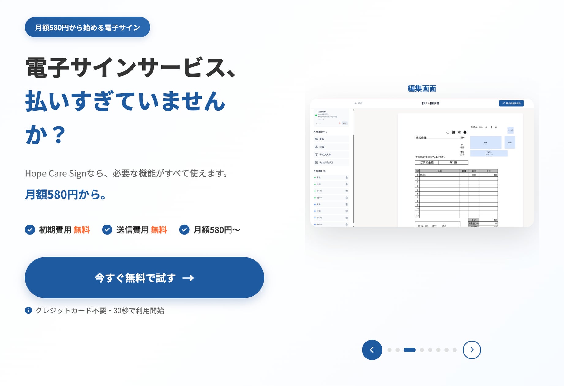 株式会社オルデンティアコーポレーションは、中小企業・個人事業主向け電子サインサービス「Hope Care Sign」を提供開始しました。月額580円からで初期費用・送信費用は無料とし、大手が提供する多機能を排してPDFアップロード→メール送信(対面・QR対応)→署名の3ステップに特化することで開発・運用コストを削減。月5件利用時で年間約12万円のコスト削減を想定し、電子帳簿保存法対応や監査証跡生成、SSL/TLS暗号化など法的・技術的な安全対策を備え、クレジットカード不要の無料トライアルや即日導入の手軽さも打ち出しています。