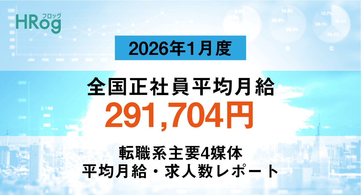 株式会社フロッグは「2026年1月度 正社員平均月給・求人数レポート」を発表しました。全国正社員の平均月給は291,704円(前月比+214円、前年同月比+6,344円)、求人数は314,640件(前月比−2,591件、前年同月比+30,565件)でした。データは『マイナビ転職』『エン転職』『doda』『type』の求人をHRogチャートで収集・集計しており、職種別・都道府県別の詳細も公開されています。集計方法や利用条件に関する注記も明記されています。ですます調でお知らせするリリースです。