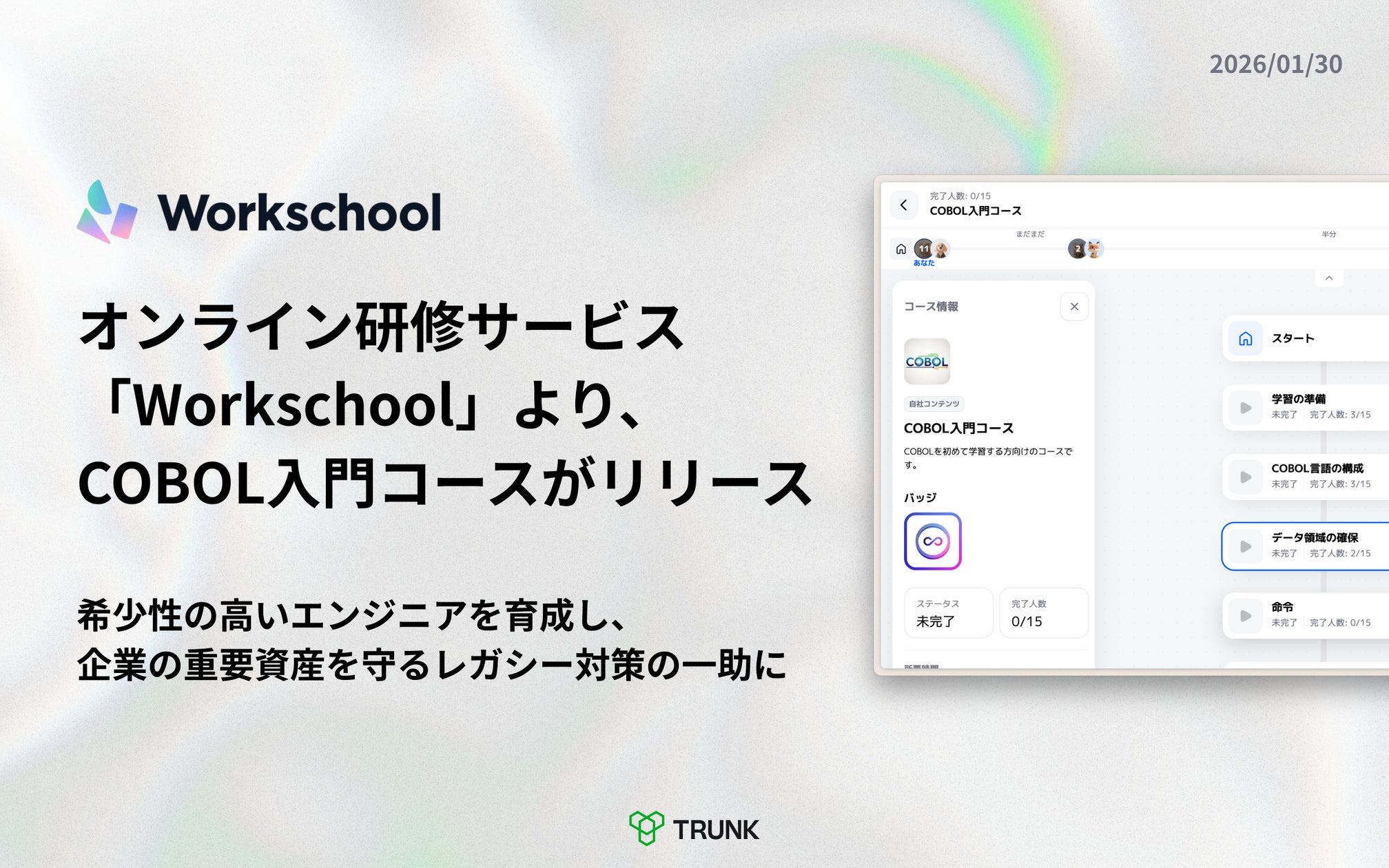 TRUNK株式会社は企業向けeラーニング「Workschool」で「COBOL入門コース」を正式リリースしました。COBOLの文法理解にとどまらず、1960年代から蓄積された既存資産を読み解く基礎を体系化し、実務に直結する演習やブラウザ上の開発環境で実践的に学べる構成です。2023年の国際規格更新も踏まえ、レガシー化や人材不足といった社会課題に対応する狙いで、ウイングシステム監修の下、企業の人材育成を支援します。Workschoolは既に1,500以上のコンテンツを有しています。