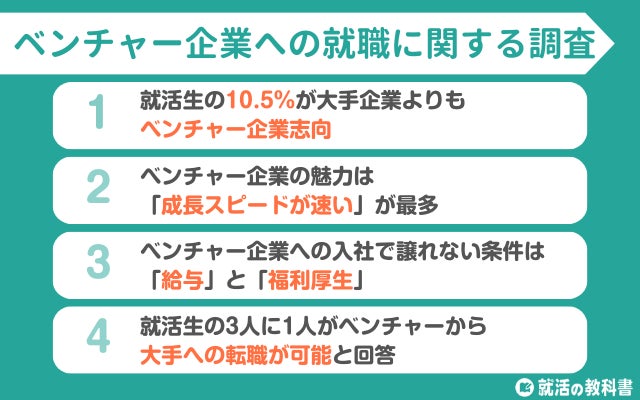 株式会社Synergy Careerが26卒・27卒の就活生200人を対象に実施した調査によると、新卒でベンチャーを希望する学生は10.5%にとどまり、61.0%が大手志向で多数派でした。ベンチャーの魅力は「成長スピードが速い」「社員の裁量が大きい」が上位である一方、ネガティブ要素は「経営の安定性の低さ」「福利厚生の不足」など安心感に関する懸念が目立ちます。ベンチャー入社で譲れない条件は給与や福利厚生、年間休日など安定要素が重視され、ベンチャーから大手へ転職できると考える学生は35.5%で意見が割れていることから、学生のキャリア観が多様化していることが示されました。