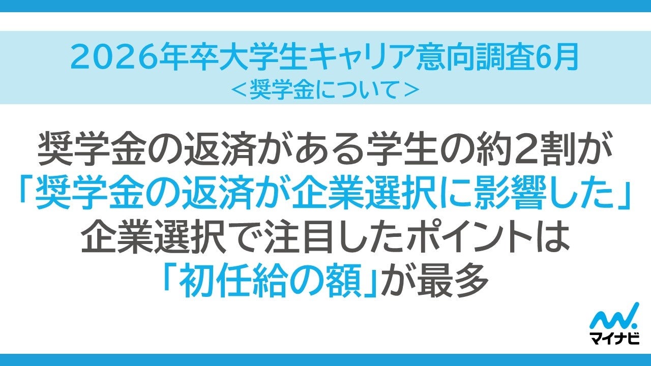 株式会社マイナビが実施した「2026年卒大学生キャリア意向調査 6月<奨学金について>」によると、全国の大学生・大学院生の36.9%が奨学金を利用しており、その約7割が返済を自身で全額行う予定です。奨学金の種類では、返済が必要な貸付型が多く、親・保護者が返済を一部または全額負担する割合は約30%に上ります。企業が奨学金返済を負担する制度はまだ少数派で、学生の約1割のみがそのような企業に入社予定です。また、約2割の学生が奨学金返済が企業選択に影響を与えたと回答し、特に初任給の額や福利厚生の充実度が重視されています。奨学金返済支援制度の存在も注目されており、今後の導入拡大が期待されています。