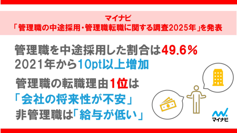 管理職の中途採用が顕著に増え即戦力確保が進んでいる点が新規性です。一方で管理職の転職理由に経営や将来性への不安が多く、組織安定性や経営判断への影響が懸念されます。 記事の概要 株式会社マイナビが2025年1〜6月の中途採用実績と直近1年の転職者を対象に実施した調査で、中途採用で管理職を採用した企業は49.6%と2021年比で約10ポイント増加しました。部長・課長クラスの採用がともに増え、採用理由は […]