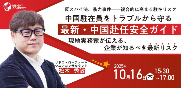 反スパイ法や対日感情の変化に伴う駐在リスクを、現地実務家の経験に基づく具体的な対策として提示する点が新規性で、企業の安全管理に実務的影響を与えます。 記事の概要 インサイトアカデミー株式会社は、2025年10月16日に無料オンラインセミナー「反スパイ法、暴力事件──複合的に高まる駐在リスク 中国駐在員をトラブルから守る“最新・中国赴任安全ガイド”」を開催します。対象は人事部や海外事業部、駐在員・駐 […]